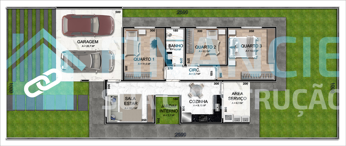 Na parte externa conta com Garagem para 02 carros, Área de Serviços, Jardim de Inverno e amplo espaço verde que possibilita futuras ampliações.